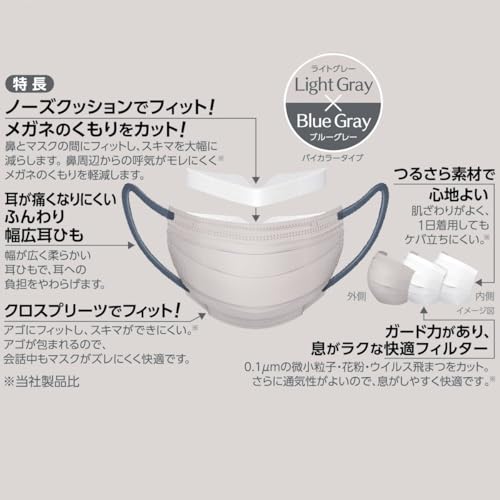 ●ノーズクッションが鼻とマスクの間にフィットし、メガネのくもりをカット。スキマを大幅に減らします。<br>●グレースタイル(ライトグレー×ブルーグレー)のバイカラータイプ。<br>●大容量15枚入り