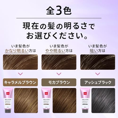 【全3色】 現在の髪の明るさで色を選んでください。キャラメルブラウン(いま髪がかなり明るい方)、モカブラウン(いま髪がやや明るい方)、アッシュブラック(いま髪が暗い方)。