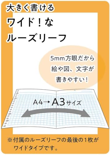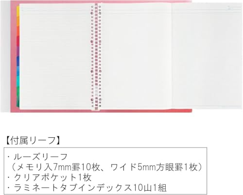 【付属】ルーズリーフ(メモリ入7mm罫10枚、ワイド5mm方眼罫1枚)、クリアポケット1枚、ラミネートタブインデックス10山1組、挿入紙(商品説明紙)1枚、キャッチシール1枚(背表紙に貼付)