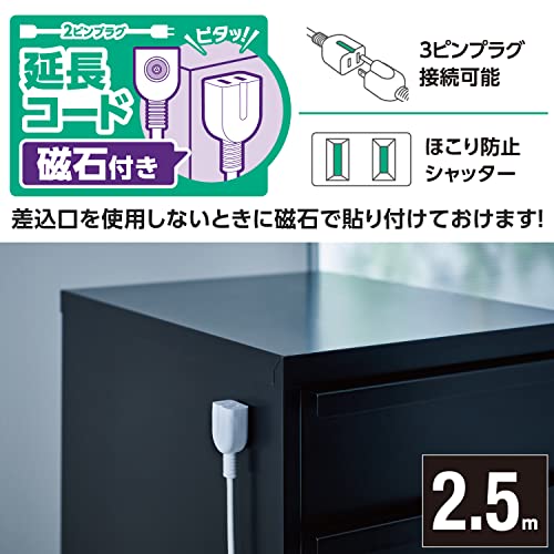 エレコム 電源タップ 延長コード 2.5m ほこり防止シャッター付き マグネットタイプ 極性対応 3ピンプラグ接続可能 ホワイト T-X01M-2125WH