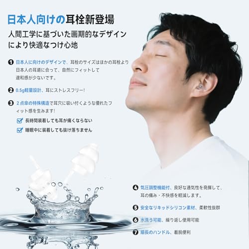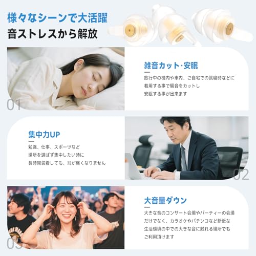 【幅広い適用場所】ご家庭、滞在先のホテル、キャンプ場、飛行機などでの睡眠時、仕事、勉強、瞑想など、集中したい時に使用することが非常に適しています。また、列車や長距離バスなどの長時間移動中にも重宝します。さらに、ライブコンサート、パーティー、クラブ、スポーツイベント、花火大会、射撃、工事現場など、うるさい環境下での不快感を軽減するためにも使用することができます。