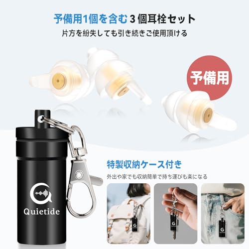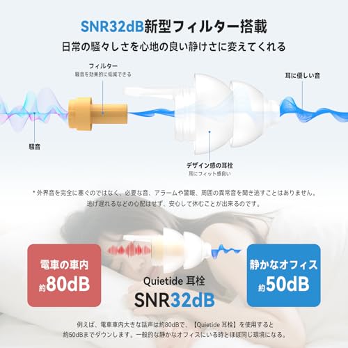 【フィルター搭載型耳栓 不要な騒音を効果的に遮断】Quietide耳栓は、独自開発のフィルターを搭載し、周囲の騒音を効果的に調整し、睡眠に適した環境を作ることができます。外部音を完全に遮断するのではなく、約32dBまで減衰させることができ、アラームや警報、周囲の異常音など必要な音を聞き逃すことはありません。災害時に逃げ遅れる心配もせず、安心して休むことができます。