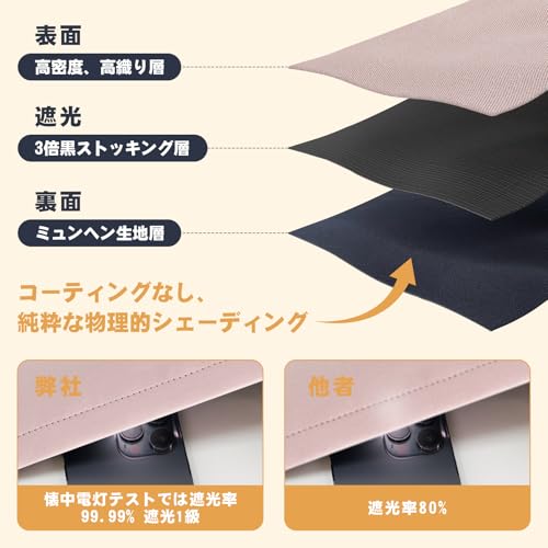 【三重織り技術】生地は三重構造のテクノロジーの技術利用して黒い系を織り込んでいるから、優れた遮光機能が備えております。きちんと室外からの日差しや紫外線などをしっかり遮られる機能付きの厚地遮光カーテンです。小窓やカラーボックスや車内などの目隠しにピッタリ。