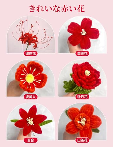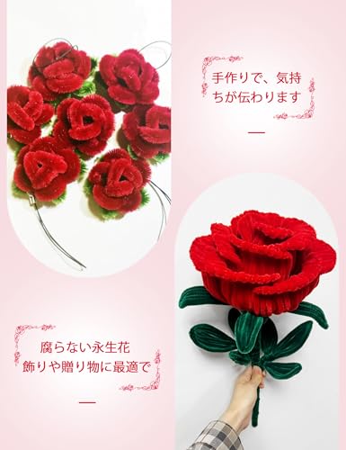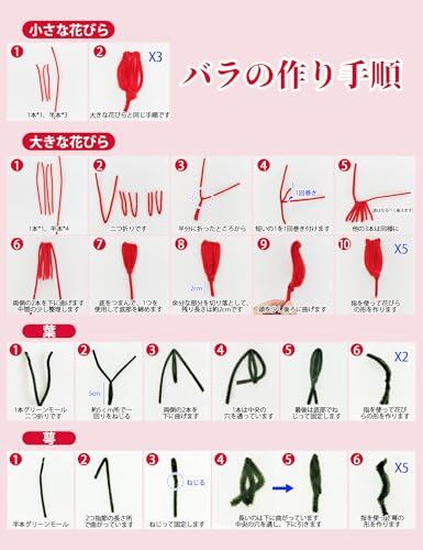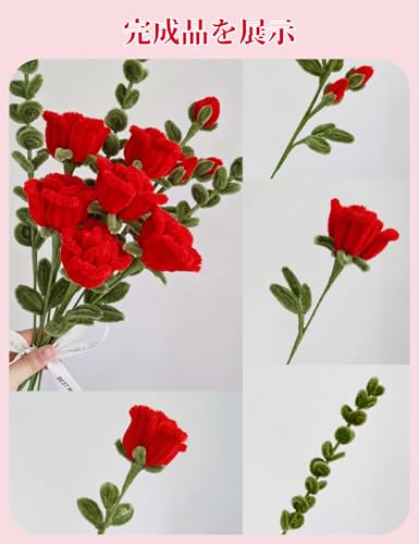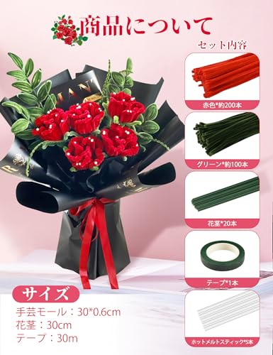 【商品仕様】セット内容:赤色*約200本+グリーン*約100本、人工花茎*20本、フラワーテープ*1個、ホットメルトスティック*5本。サイズ:手芸モール約30*0.6 cm、花茎の長さ約30cm。お客様のご意見を伺って、改良を加え、今は商品セットに説明書を付属します