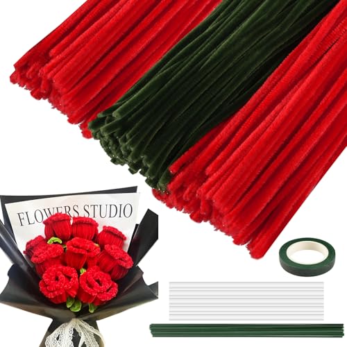 手芸モール バラの手芸キット 赤色 +グリーン色 約300本 6mm カラーモール 人工花茎20本 フラワーテープ1巻付き DIY モールフラワー インテリア飾り/手芸用 工作モール 記念日/誕生日/母の日/バレンタインデー贈り物【改良・説明書を付き】