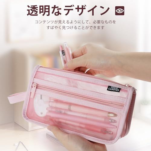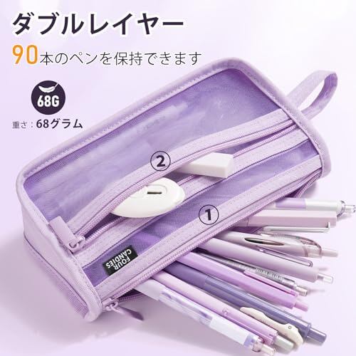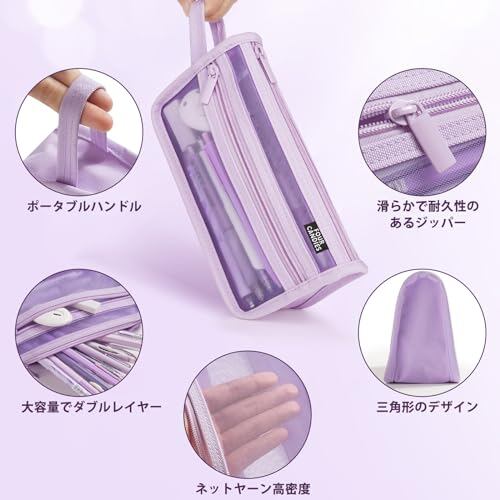 Four Candies ペンケース 筆箱 透明 メッシュポーチ 大容量 ハンドルとジッパー付き クリアダブルレイヤー筆箱 マーカーポーチ 旅行化粧バッグ 女の子 男の子 大人のオフィスや学生のための可愛い透明文房具-パープル
