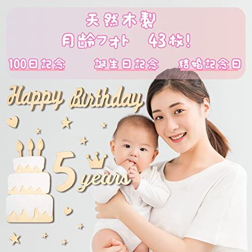 Oaec 月齢フォト 天然木製 マンスリーカード 43枚セット ベビーマンスリーカッド 長持ち ニューボーンフォト 小物 月齢カード 寝相アート 写真道具 撮影アイテム 記念日フォト 新生児 成長記録に 赤ちゃん 出産祝い 男の子 女の子 再利用可能 (ケーキ-43枚)