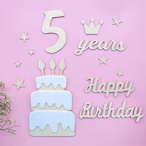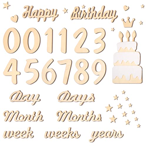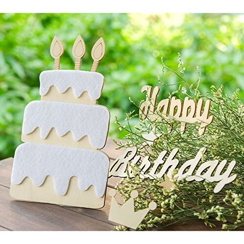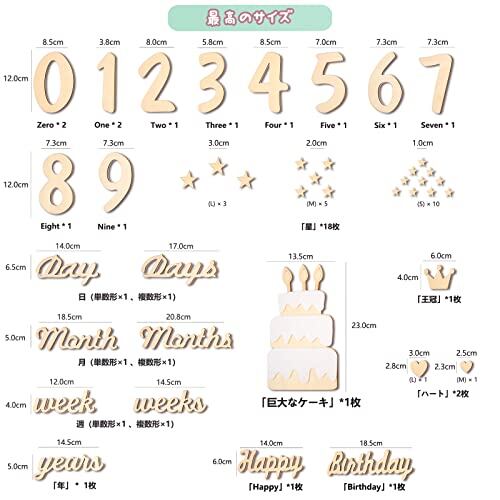 【豊富な要素】:「巨大なケーキ」*1枚、「0」*2枚、「Happy」*1枚、「Birthday」*1枚、「1」*2枚、「2」~「9」各1枚、「Day(s)」各1枚、「week(s)」各1枚、「month(s)」各1枚、「years」*1枚、「王冠」*1枚、「星」*18枚、「ハート」*2枚、合計 4 3 枚。厚さ約3mm。この43枚セットには、お祝いのフレーズ「Happy Birthday」と非常に特別な巨大なケーキ型の木製チップが付属しています。
