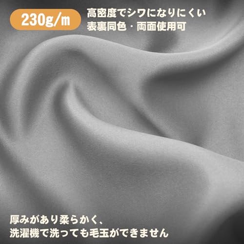 【柔らかい高密度生地・表裏同色】高密度と柔らかい生地で使用、表裏同色両面を使用できます。厚みがあり、柔らかく、洗濯機で洗っても毛玉ができません。お手入れしやすいのでいつも清潔に使用できます。カーテンの重みで洗濯ジワも伸ばすことができので、形態安定としてはとても効果が期待できます。