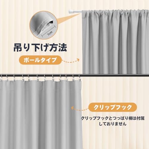 【取付方法】両端の直径2.0cm以下の突っ張り棒が使用可能です。*別途対応可能な突っ張り棒をご用意ください。ご注意:同じ等級であっても、カーテンの明度や色彩によって遮光の度合いが変わります。薄い淡い色は光を通しやすく、濃い暗い色は光を通しにくいです。遮光性を重視される方は濃色をおすすめします。