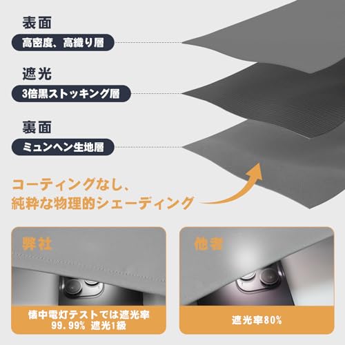 【生地】遮光1級生地(遮光率99.99%以上)を使用,外からの光をほとんど通さない、夏場の断熱効果、冬場の保温効果が期待できます。 昼間カーテンを閉めたお部屋のなかで相手の顔の表情が分からない程度にまでお部屋を暗くできます。同じ等級であっても、カーテンの明度や色彩によって遮光の度合いが変わります。薄い淡い色は光を通しやすく、濃い暗い色は光を通しにくいです。遮光性を重視される方は濃色をおすすめします。