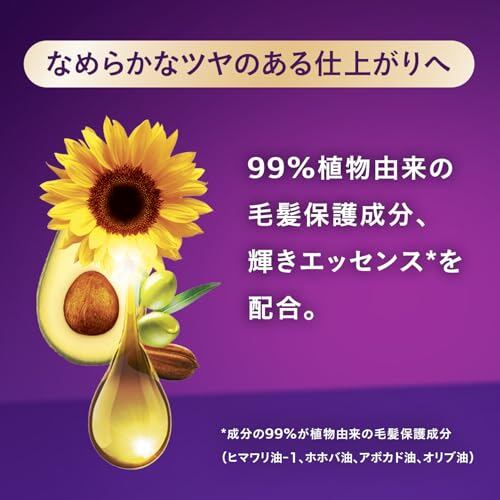 【なめらかなツヤのある仕上がりへ】 成分の99%が植物由来の毛髪保護成分、輝きエッセンスを配合(ホホバ油、アボカド油、オリブ油、ヒマワリ油)