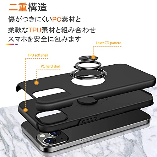 アイフォン14 ケース リング付き 耐衝撃 TPU 二重構造 iPhone 14 用 バンカー リング カバー Uovon スマホケース リングつき スタンド機能 車載ホルダー対応 擦り傷防止 落下防止 おしゃれ · ブラック