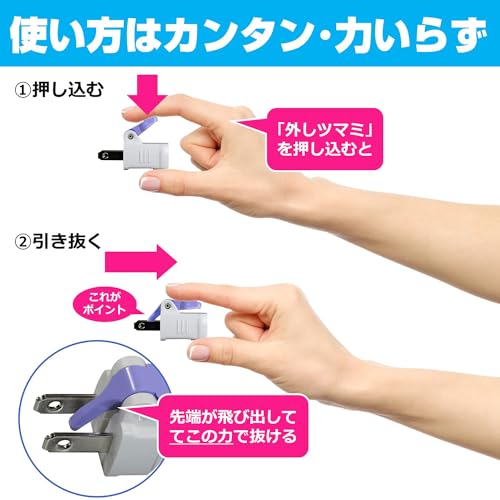 【押すだけ簡単】アダプターの外しツマミを指先で押すだけでプラグが簡単に抜けます。