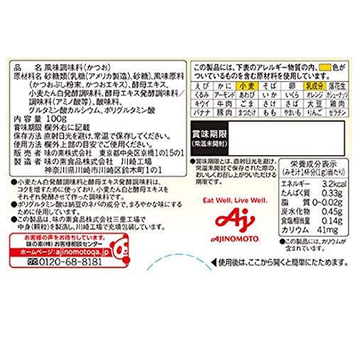 原材料:調味料(アミノ酸等)、砂糖類(乳糖、砂糖)、風味原料(かつおぶし粉末、かつおエキス)、食塩、酵母エキス、小麦たん白発酵調味料、ポリグルタミン酸