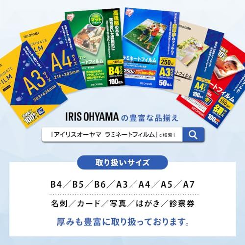 【特徴】:厚さ100ミクロンのラミネートフィルム100枚入り.名刺サイズからA3サイズまで、9サイズの品揃え.