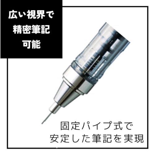 製図用シャープに使用される固定パイプ式のペン先。ペン先がよく見え、紙面の明るさを保つため、小さい文字の筆記や図の作成、定規を利用した筆記などの学習に適します。