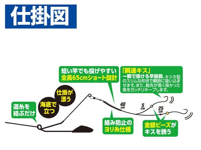 「瞬速キス」一瞬で掛ける早掛鈎。キツネ型のスリムな形状で瞬時に吸い込ませます。また鈎先が高く、掛かった魚をがっちりキープします。