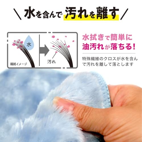水で洗うと繊維が広がり、つかんだ油汚れを離すので、クロスについた汚れは水だけで洗い流せる。