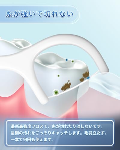 強い 細いのフロス:糸は細く、張りがあるので、切れにくいです。フロスは、採用進化強いポリスチレンを束ねて糸状にしたも。糸が細くてめっちゃ強い、毛羽立たず、糸は細めなので狭い歯間にもちゃんと入ってくれます、使用中に糸が切れたりはしないです。洗って何回でも使えます。