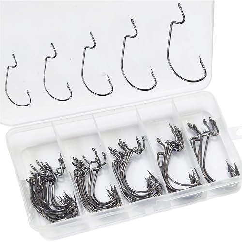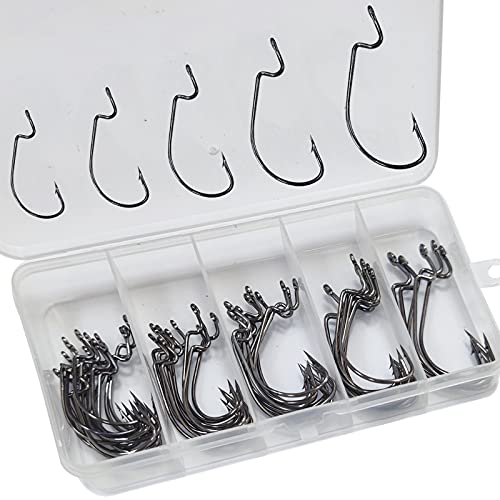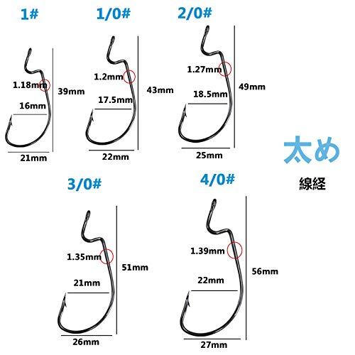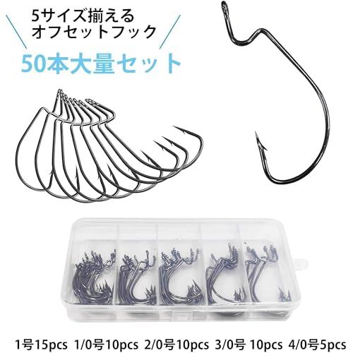 【50本セット】:使用頻度高い5サイズオフセットフックが合理的な比率でセットされ、無駄なサイズは不要セット内容:1号15pcs 1/0号10pcs 2/0号10pcs 3/0号10pcs 4/0号5pcs 多数タイプのワームにマッチでき、ワームとシンカーなどにセットし、ワームリグの自作に本当に便利です。