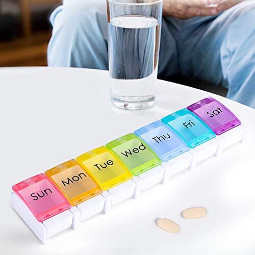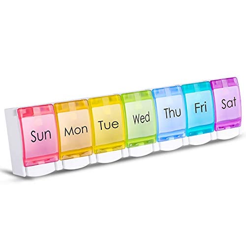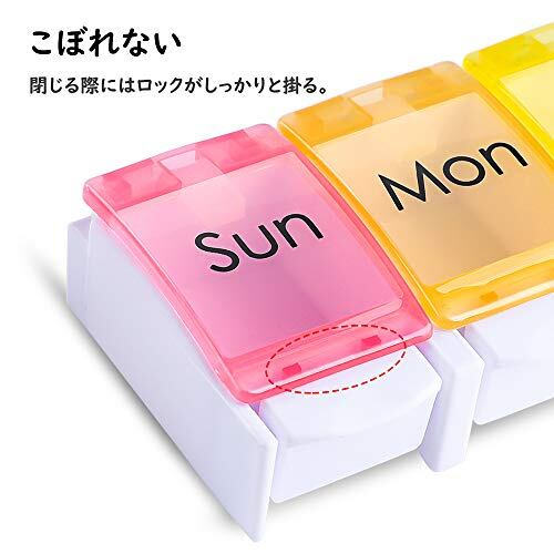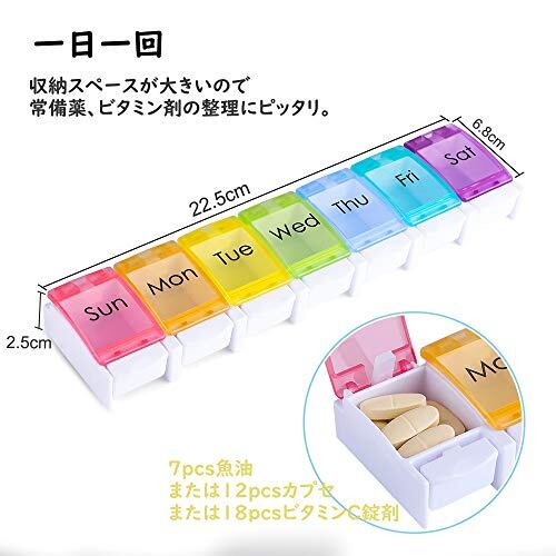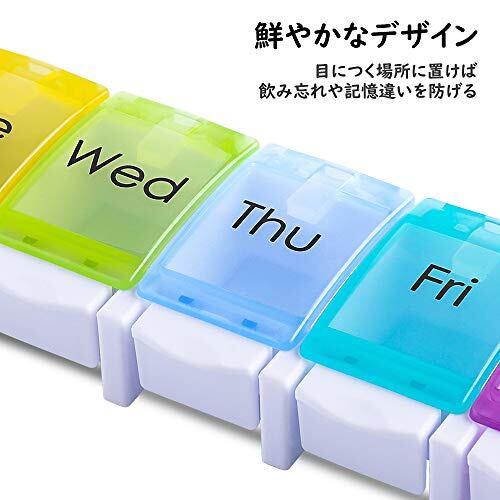 【飲み忘れ防止・オシャレ】:一週間分のお薬やサプリメントなどを保存できます。曜日ごとにカラフルな色に分けてあります。半透明な蓋で、中身が見えるようなデザイン、英語表記があって、飲み忘れや記憶違いの防止に役に立ちます。