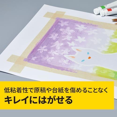 【貼っても安心なドラフティングテープ】低粘着性で台紙などを傷めることなくキレイにはがせます。トレーシングペーパーやデザイン用紙の仮止めなどに便利です。