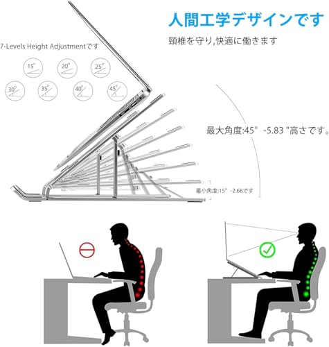 【最新人間工学設計】本パソコンスタンドは7段階高さ調整ができ、高さを5~15.5cmまで調節できて、台座の傾斜角度も0~40°まで変えられますので、お好みの高さに合わせることで、猫背を防ぎ長時間のデスクワークでも体への負担を低減します。最適な姿勢を整えて、首、肩、背中などへの負担が軽減されています。