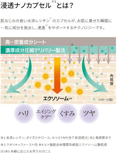 ナノカプセルテクノロジー採用: 肌なじみの良い水添レシチンのカプセルが、肌に乗せた瞬間に一気に成分を放出浸透し肌に潤いを与えます