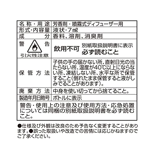 【内容量】7ml(1日1時間レベル2で使用した場合約8.5か月持続 *噴霧式ディフューザー2の場合)
