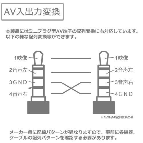 4極ミニプラグの映像入出力(AV端子)のGND(アース)の変更も可能です。異なる配線パターンのAV接続ケーブルであっても本製品を組み合わせる事でご利用可能です。3番、4番の変換で配列が合致する製品の組み合わせのみ