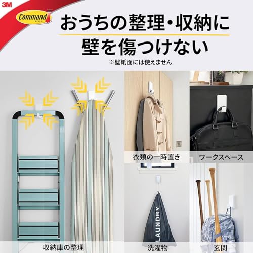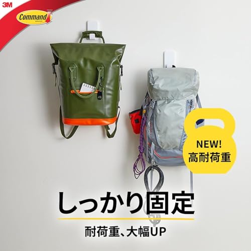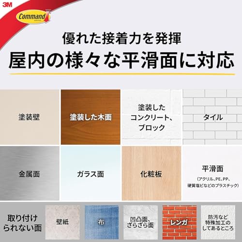 【ツルツル面にしっかり固定】ガラスやタイルなど、屋内の様々な平滑面にしっかりと設置できる強力なコマンド フック。大きなバッグ、厚手のコートやジャケットなどもしっかりと支え、備品などの収納に便利。