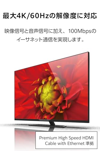 最大4K/60Hzの解像度に対応したHDMI変換アダプターです。Premium High Speed HDMI Cable with Ethernet準拠で、映像信号と音声信号に加え、100Mbpsのイーサネット通信を実現します。