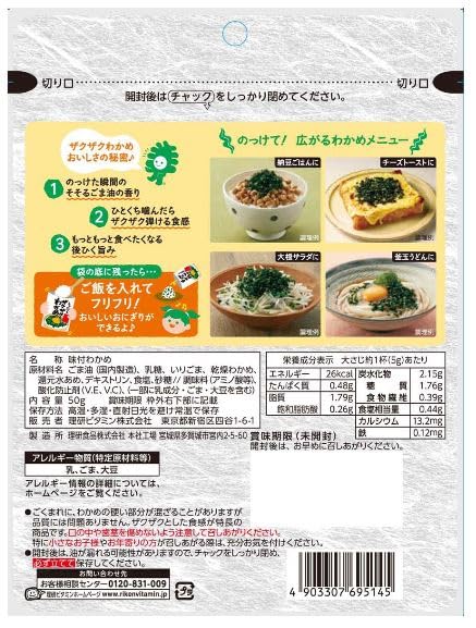 ごま油(国内製造)、乳糖、いりごま、乾燥わかめ、還元水あめ、デキストリン、食塩、砂糖//調味料(アミノ酸等)、酸化防止剤(V.E,V.C)、(一部に乳成分・ごま・大豆を含む)