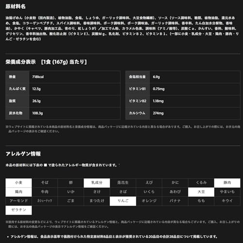原材料:油揚げめん(小麦粉、植物油脂、食塩、しょうゆ、香辛料)、ソース(ソース、糖類、植物油脂、還元水あめ、食塩、香辛料、ポークエキス、ポーク調味油、たん白加水分解物、香味油)、かやく(キャベツ、味付豚肉、青のり、紅生姜)/加工でん粉、カラメル色素、調味料(アミノ酸等)、炭酸Ca、かんすい、香料、酸味料、グリセリン、ベニコウジ色素、香辛料抽出物、酸化防止剤(ビタミンE)、炭酸Mg、ビタミンB2、ビタミンB1、(一部に小麦・乳成分・大豆・鶏肉・豚肉・りんご・ゼラチンを含む)