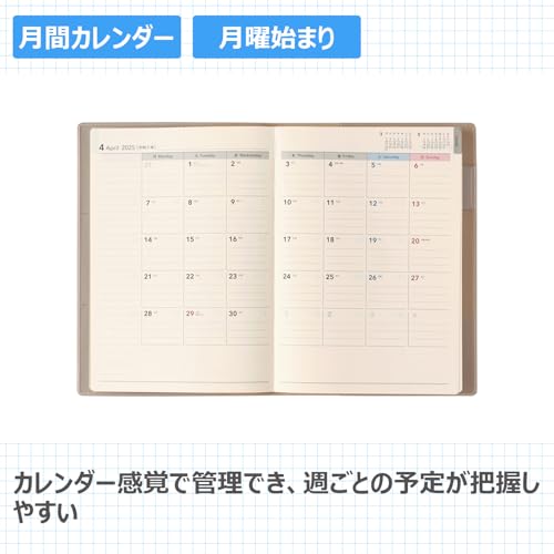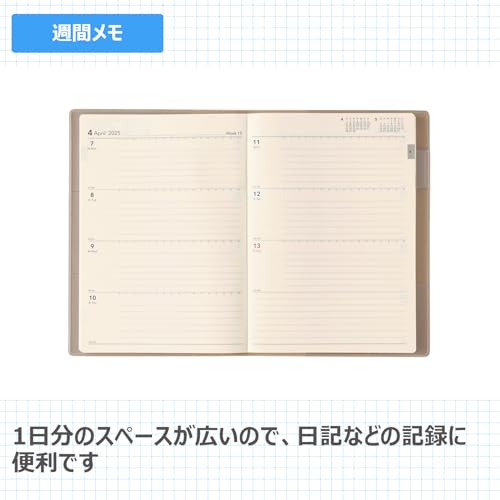 【商品説明】「書く」ことを第一に考えた記入スペース充実のシンプルダイアリーメモページがノート1冊分あり、手帳とノートを一括管理したい人におすすめ。カバー前側には3段名刺ポケット、カバー後ろ側には名刺ポケット・ペンホルダーがついています。【月間ページ】見開き1ヶ月のベーシックなブロックタイプ(月曜始まり)。カレンダーと同じような感覚で見ることができ、週ごとの予定が把握しやすいのが特徴です。【週間ページ】見開き1週間で、左右のページに日付が分割されているメモタイプのレイアウト(月曜始まり)。1日分のスペースが広いので、日記などの記録に便利です。モデルチェンジ:●扉のデザインを変更しました