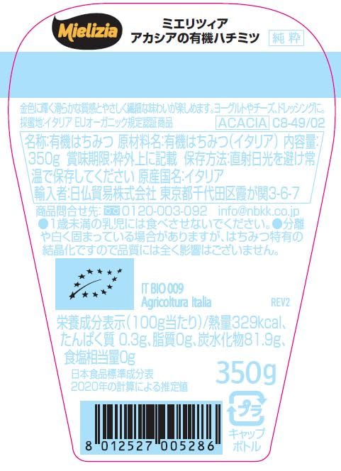 Mielizia(ミエリツィア) アカシア の 有機 ハチミツ (スクイーザーボトル) 350g はちみつ (100% オーガニック 非加熱 bio)(イタリア 産)