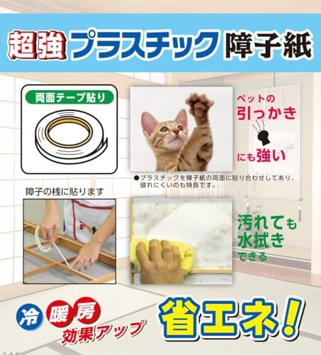 プラスチックを障子紙の両面に貼り合わせしてあり、破れにくく、ペットの引っかき傷にも強い障子紙です。