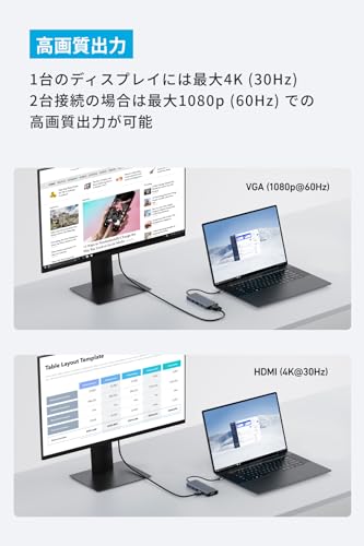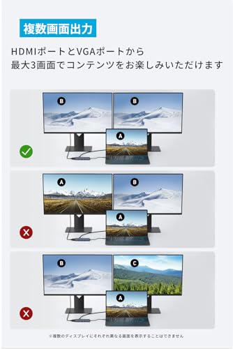 複数画面出力:4K対応HDMIポートと1080p対応VGAポートを使用して、同時に2画面へ出力することが可能です。(複数のディスプレイにそれぞれ異なる画面を表示することはできません)