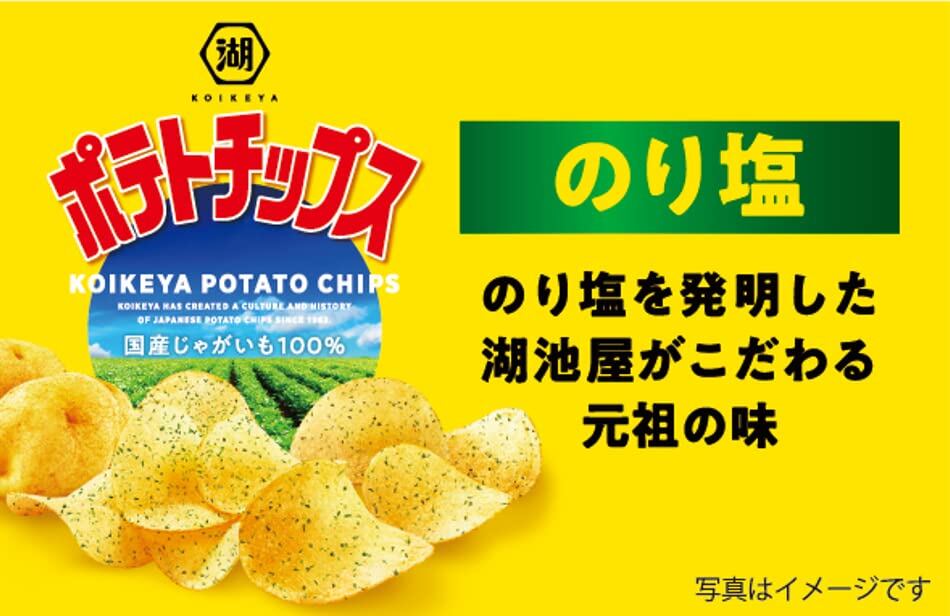 のり塩を発明した湖池屋がこだわる、青のりとあおさの風味に塩が絶妙に広がる元祖の味です。