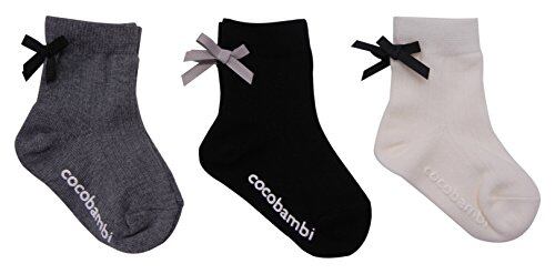 cocobambi 3足組子供靴下クルー丈 リボン付き 9cm - 14cm スベリ止め付 GY