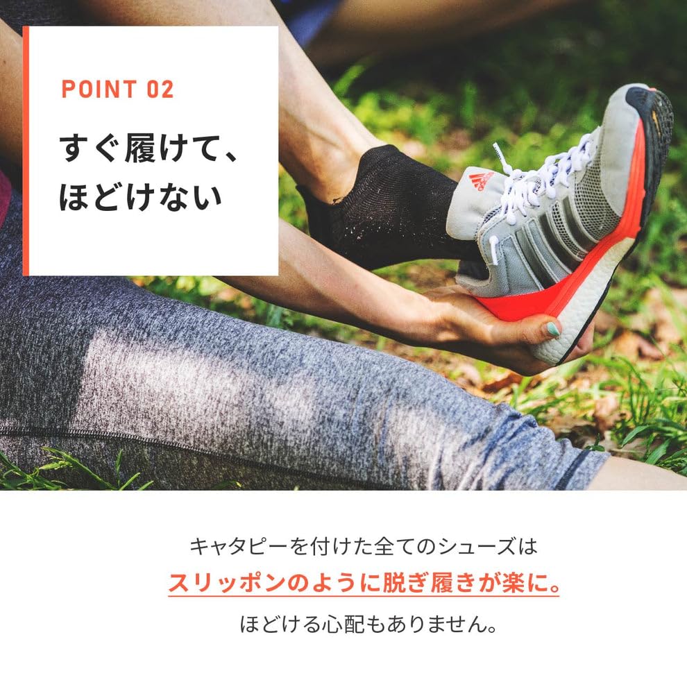 【ランニングにも最適】キャタピーは伸縮するひもだから、気持ちよくフィットしているのに足の動きを邪魔せず疲れにくい。