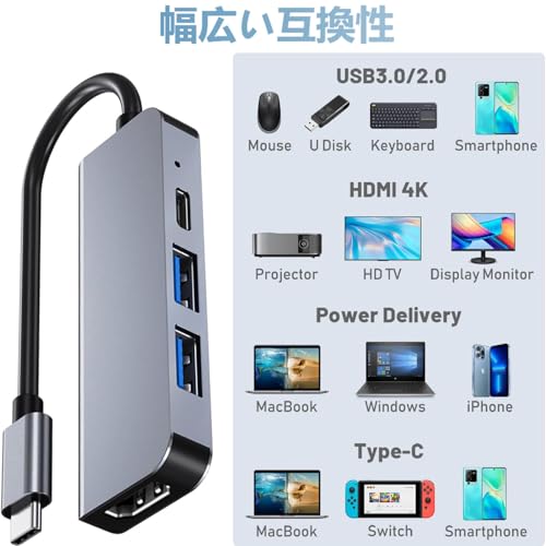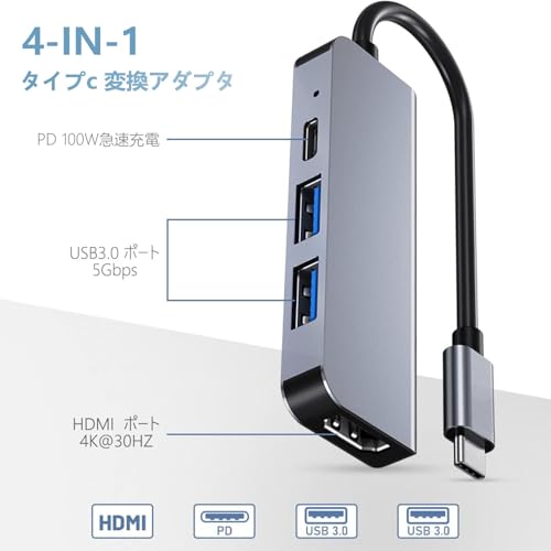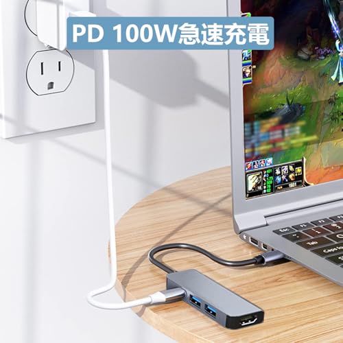 USB-C 変換アダプタ 4-in-1「4K HDMI映像出力+PD 100W 急速充電+USB3.0高速データ転送」HDMI Type C ハブ 在宅勤務 設定不要 タイプc 変換 アダプタ MacBook Pro/Air、iPad Pro、Switch、iMac、XPS、Surface Goなど対応