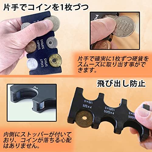 6種類すべての硬貨を収納できる 500円硬貨が4枚、100円・50円・10円・5円・1円硬貨が各5枚収納できる、プラスチック製のホルダー式コインキャッチャーです。硬貨が落ちない特殊なコインストッパーが付いていて、1枚だけもしっかりホルダーにとどまります。その上、片手で硬貨を取り出せるので便利です。ホルダーを収納できる、別売りの専用ケースも販売されています。