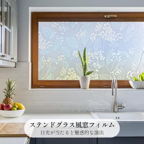Qualsen 窓ガラス目隠しフィルム 窓 めかくしシート 目隠しシート窓ガラスフィルム ステンドグラス シール 水で貼ってはがせる 外から見えない UVカット 飛散防止 (44.3 x 200 cm, 白果樹)
