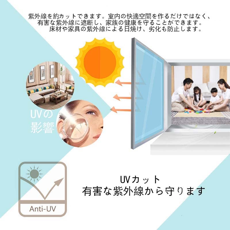 【UVカット、有害な紫外線から守ります】: ガラスを通して入る大量な有害な紫外線をカットします。紫外線による家具や床材の変色を守ります。フローリングや畳、カーペットなどの床材、インテリア・家具の紫外線による日焼け、劣化を防止します。