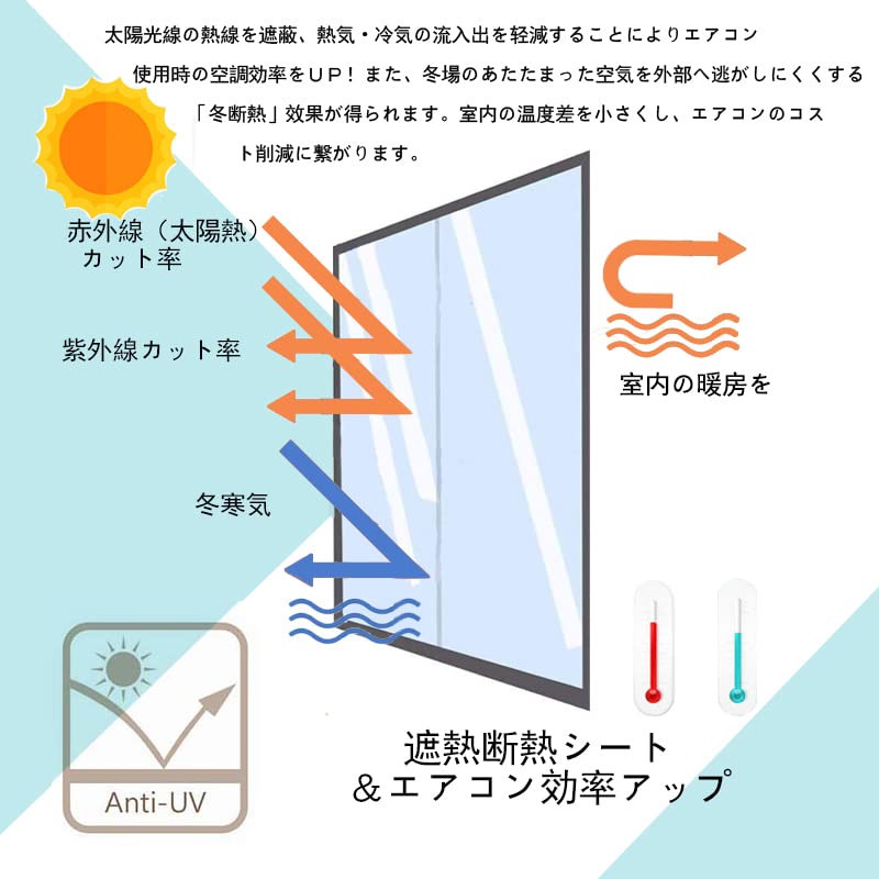 【省エネ・節電】: 夏は涼しく冬は暖かく、居住スペースを快適に演出。外からの熱を遮断(遮熱效果)、お部屋の暖気を逃がしません(断熱效果)。太陽光線の熱線を遮蔽、熱気・冷気の流入出を削減することによりエアコン使用時の空調効率をUPまた、冬場の温まった空気を外部へ逃がしにくくする「冬断熱」效果が得られます。