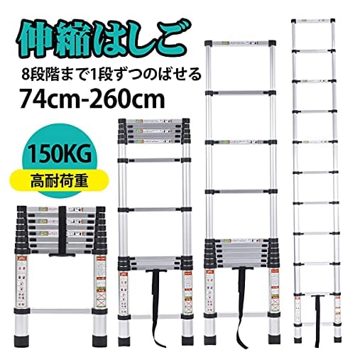 【サイズ詳細】2.6メートルタイプは折り畳み時サイズ(約):幅(足含む)46cm×奥行き7cm×高さ73.6cm 展開時サイズ(約):幅(足含む)46×高さ260cm 階段数量:ステップ9個(最上段を含めて10個)となっており、ステップの幅は各4cmとなっております。 重量:6.85kg 耐荷重:150Kg 【サイズ詳細】2.6メートルタイプは折り畳み時サイズ(約):幅(足含む)46cm×奥行き7cm×高さ73.6cm 展開時サイズ(約):幅(足含む)46×高さ260cm 階段数量:ステップ9個(最上段を含めて10個)となっており、ステップの幅は各4cmとなっております。 重量:6.85kg 耐荷重:150Kg