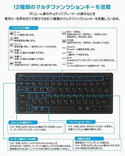 ✅【bluetooth5.1 キーボード、2.4G USB無線接続機能がない】 ご注意:このキーボードはBluetooth接続式で、2.4G USB無線接続機能がないので、Bluetooth機能ないデバイスに使用できません。良くご確認頂いた後ご購入ください。ワイヤレスキーボードはJIS日本語配列レイアウトを採用し、パソコンやタブレット、スマートフォンなど、3台までのデバイスをペアリング可能、切り替えボタンを押すだけで、使用シーンに合わせてデバイスを瞬時に切り替えることができます。さらに、便利な、ボリューム調整やメディアプレーヤーの操作などが可能な専用のマルチファンクションキーが12種類搭載しています。