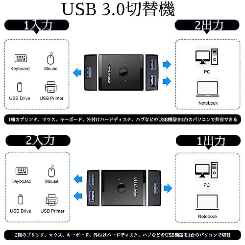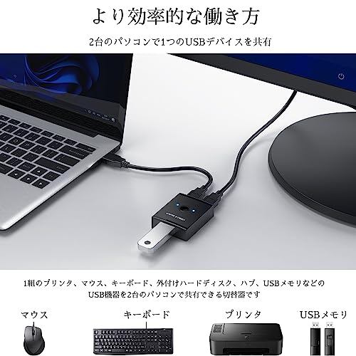 usb切替器 切り替え機 pc2台用 usb3.0 マウス キーボード 切り替え器 usb セレクター プリンタ 手動切替機 【パソコン2台:USB機器4台】USBケーブル×2(1.5m)付